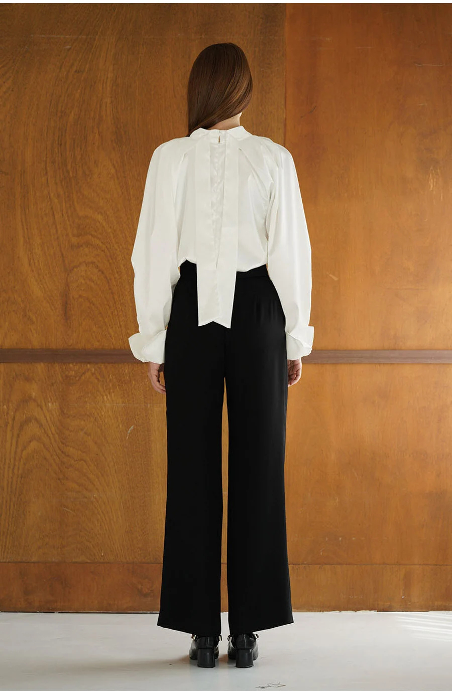 This ivory shirt is modern and sophisticated, with clean, flowing lines and a soft, comfortable texture. The silky satin fabric drapes beautifully, flattering the figure; the high collar and sculpted shoulder pleats create refined lines and a subtly architectural silhouette. The puffed sleeves gather into wide cuffs, adding a touch of understated drama without sacrificing elegance and practicality—making it ideal for the office, a dinner date, or any occasion where you want to project understated luxury.