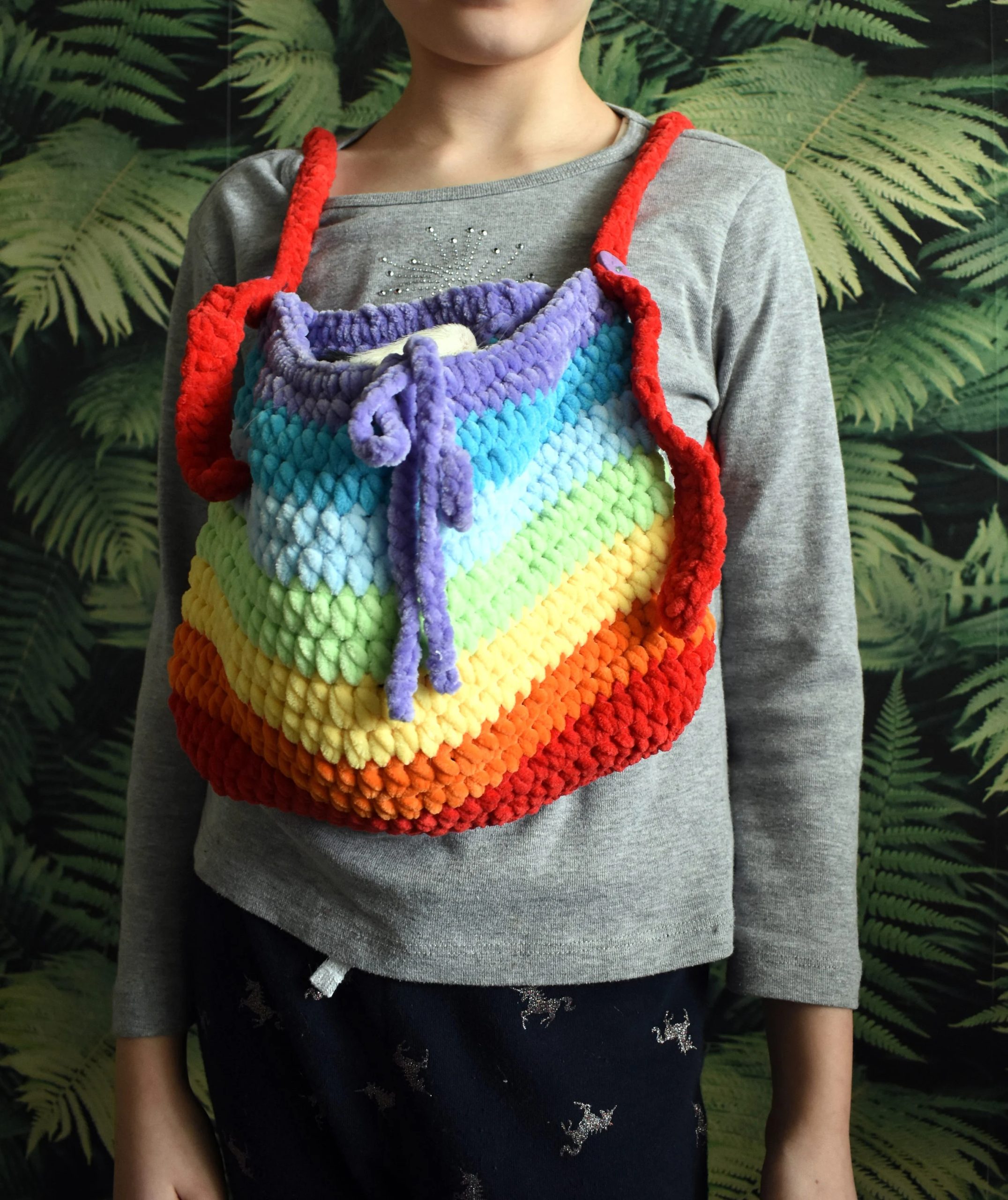 Crafted from handmade gradient knit fabric, the full color spectrum transitions seamlessly from red to orange, yellow, green, blue, and purple, creating a “rainbow waterfall” woven into the bag. The fabric is as soft as cotton candy, skin-friendly, and fluffy. The eco-friendly dyes are safe and odor-free, making it safe for pets to lick. It’s comfortable against delicate skin and won’t swell or repel you for long periods.
