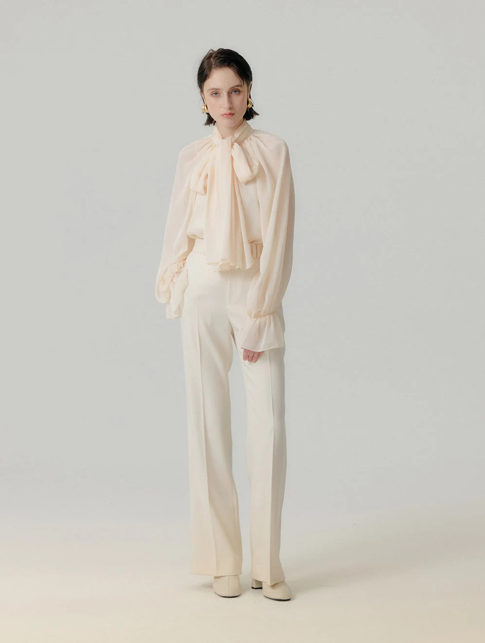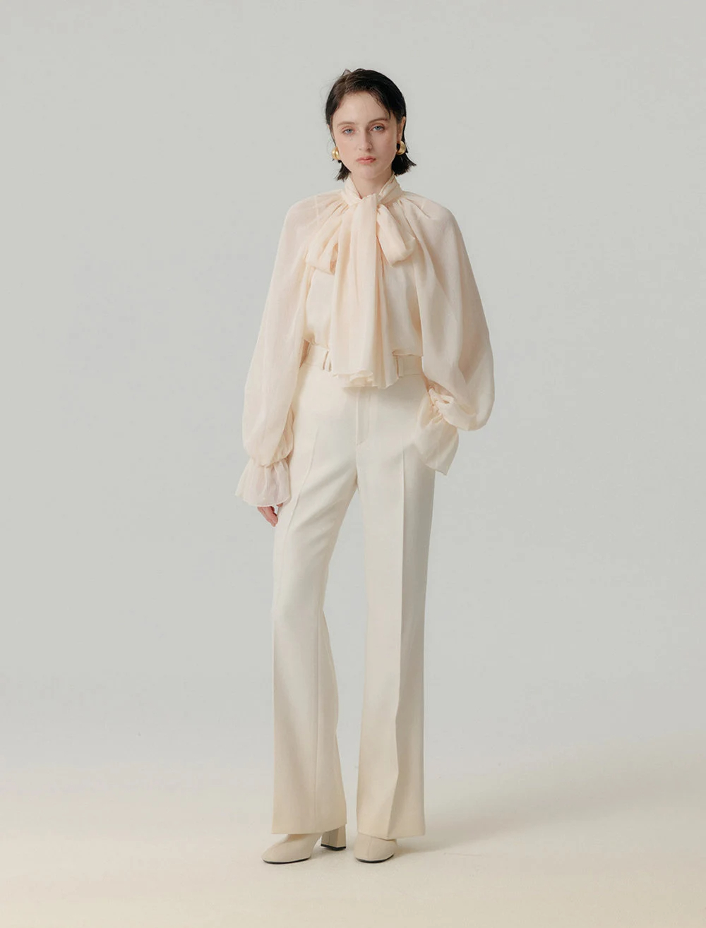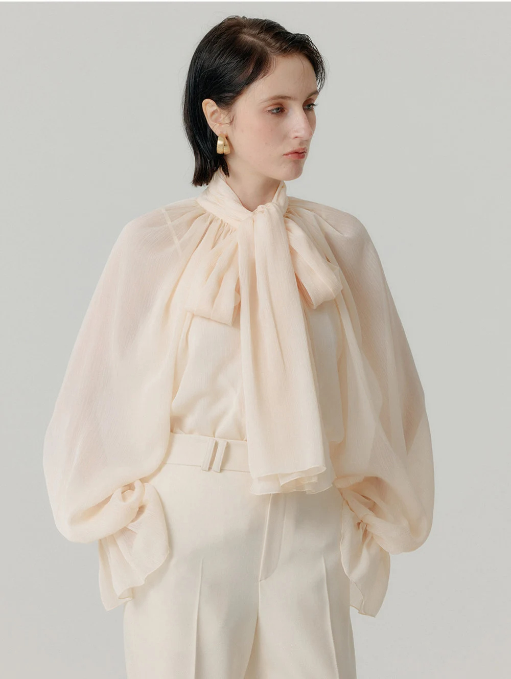 This soft pink chiffon blouse is romantic and light, making you elegant with every step. The oversized bow neckline exudes sophistication, while the flowing silhouette gently hugs the body, creating a cloud-like lightness. Long, puffy sleeves with slightly flared cuffs add a touch of drama and femininity, making it the ideal choice for elegant everyday wear, special evening events, or any occasion where you want to showcase understated luxury.